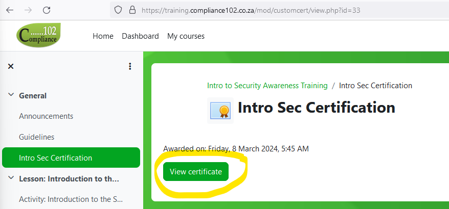 Once you have been redirected to the training Portal, click the “View Certificate” Button